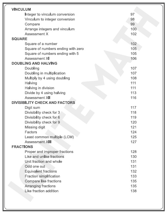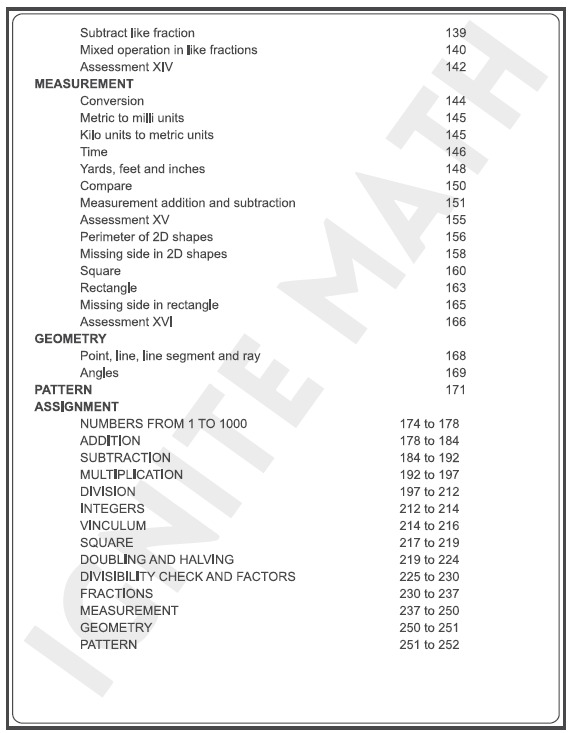 Ignite Math Tier 3 is based on Ancient Indian Mathematics known as Vedic Math. This book is a continuation of Ignite Math Tier 2 and is suitable for children aged 7 years and above. It covers numbers 1–1000, addition, subtraction, multiplication, division, fraction, integer, divisibility check, basic shapes, measurement and vinculum. This book introduces both general methods and special shortcut techniques that help students solve problems quickly through observation. Each topic includes descriptions, illustrations, tasks, and corresponding assignments at the back to reinforce understanding. Ideal for both home and classroom learning.